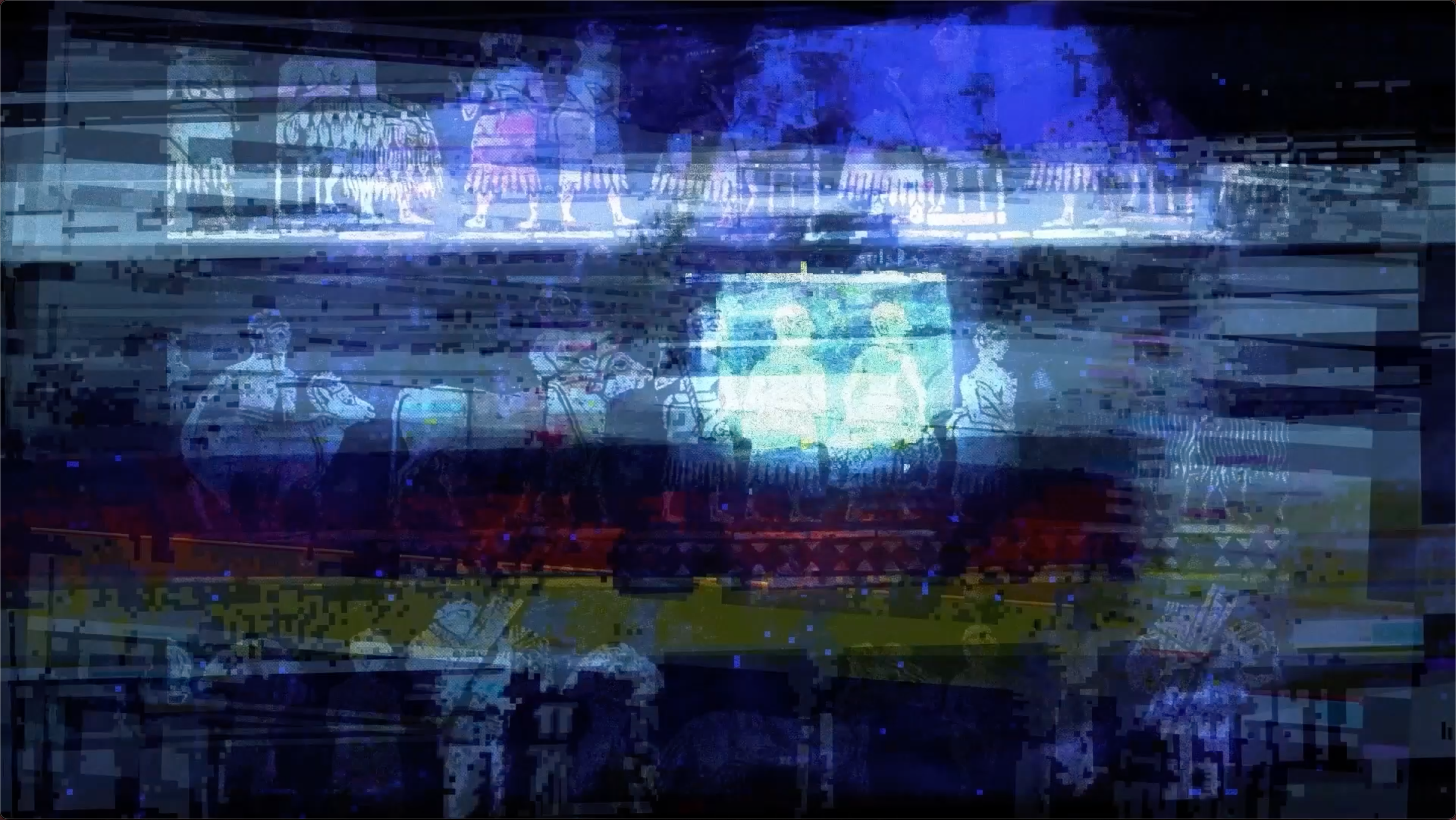 Pulsing bass, sliding drones, and radical digital distortion provide a soundscape for this horror short.
