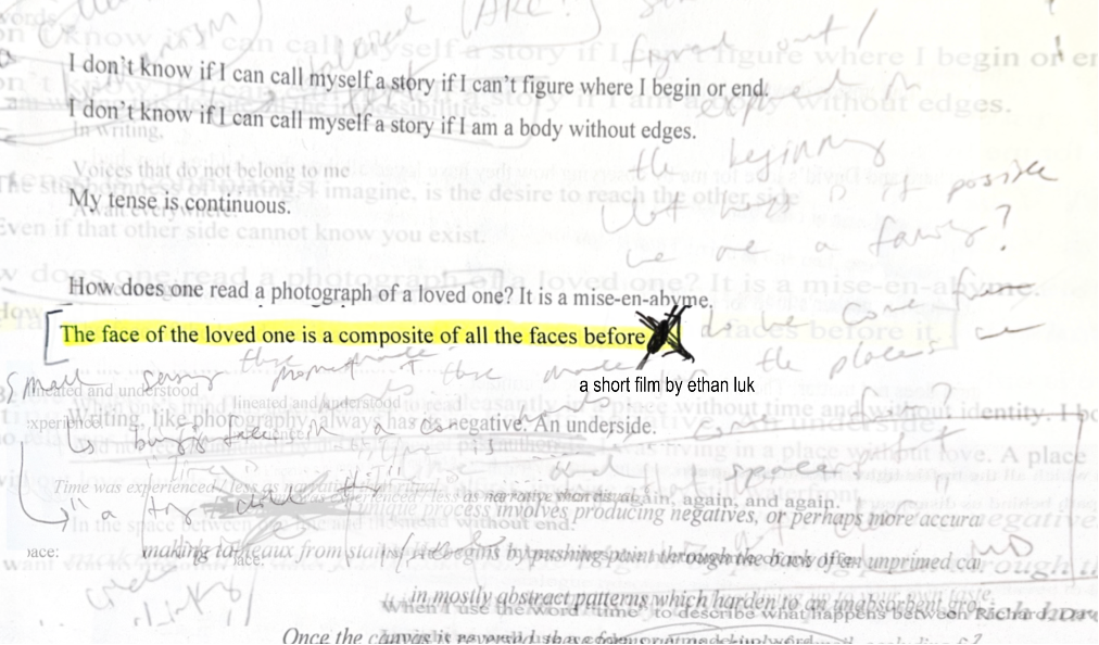 In 2020, I encountered an article chronicling the story of two Hong Kong expats, Richard and David, who were trying to adopt as a couple in a locality where queer folks rarely get approved to do so. In 2024, I adapted the article into a book-length poem that inhabits the voice of Richard and David’s non-existent child. “the face of the loved one…” synthesizes both experiences in 2020 and 2024 by layering a new medium, film, onto the continued afterlife of the article. The film, a meta-documentary of sorts, records my process of reading, remixing, and translating a queer narrative.